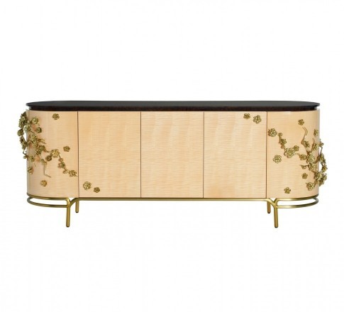 Walnut Burl Veneer Top with Sycamore Figured Veneer, Cast Brass Flower Branches and Metal Legs